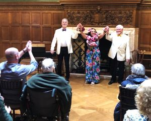 Hampton Court PalaceNick, Maria and Glenn at Hampton Court where Capability Brown lived as Master Gardener. He planted the Great Vine which still grows strong. The group perform three concerts for 300 older guests in the Clore Centre.